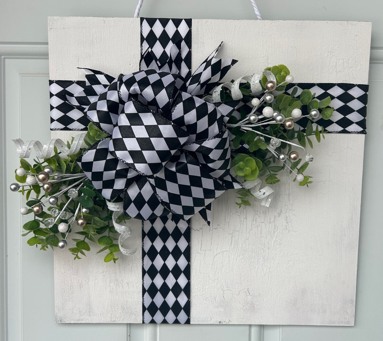 16" Square Wood Door Hanger White crackled destressed Christmas present themed. Black and white diamond shape bow with greenery and glittered white, silver spirals, gold, white, silver balls. For Christmas Decor.