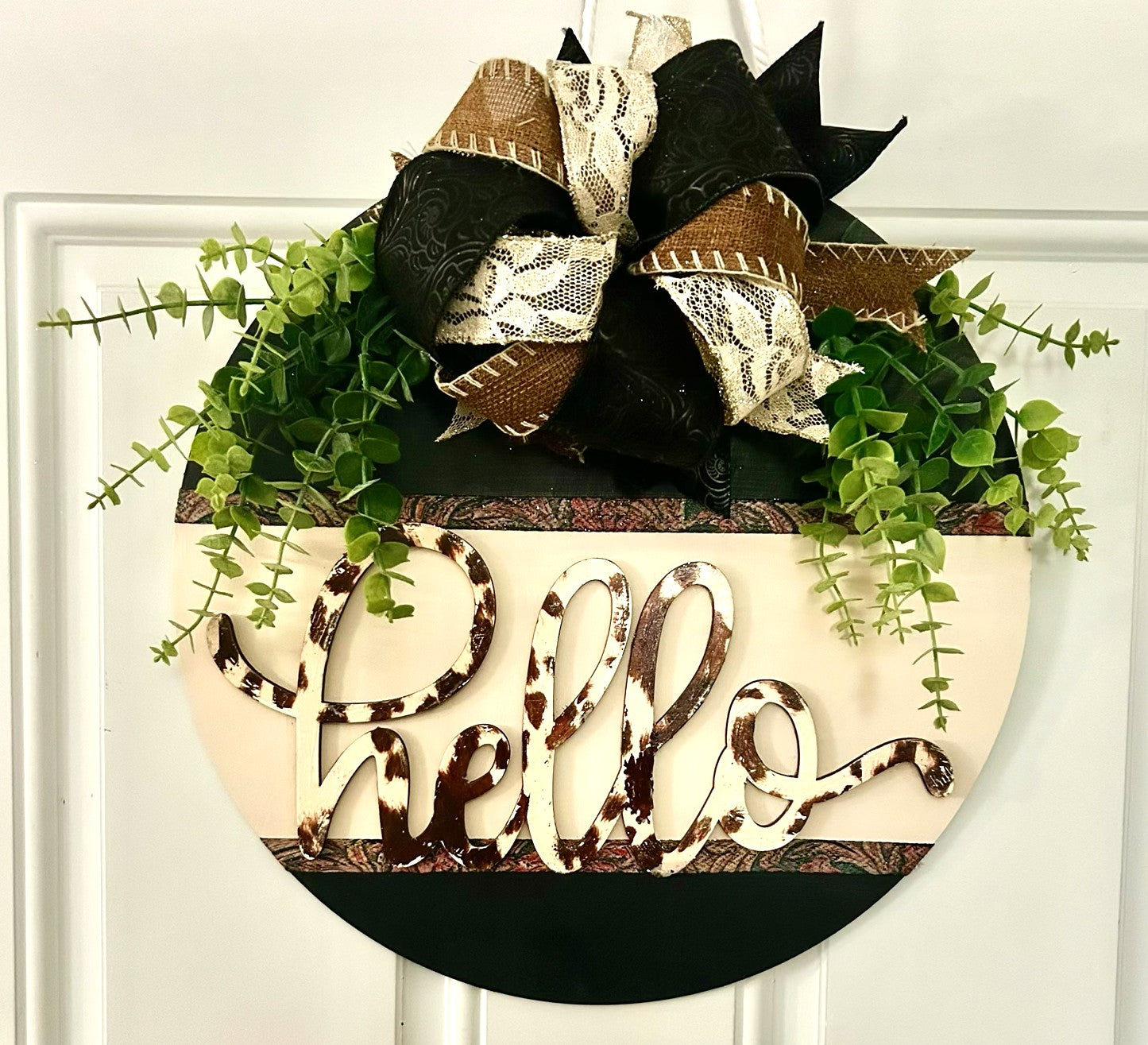 16" Round Wood Door Hanger Black and cream color block cow printed hello with tooled pinstriping. Glitter lace, brown and black tooled bow with greenery. For ever day decor.
