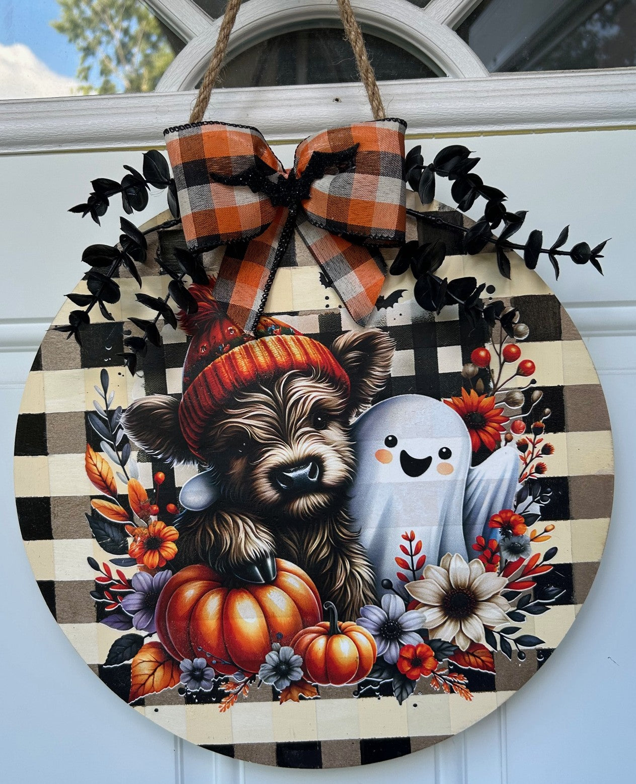 13.5" Round Wood Door Hanger with Checkered Bat Bow and Black Greenery for Halloween Decor