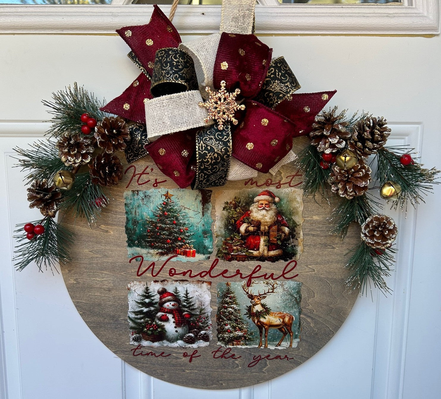 16" Round Wood Door Hanger Gray Vintage Christmas themed scenes. With green/gold laced, red/gold polka dots, and cream bow & "It's The Most Wonderful Time of the Year " Text for Christmas Decor.