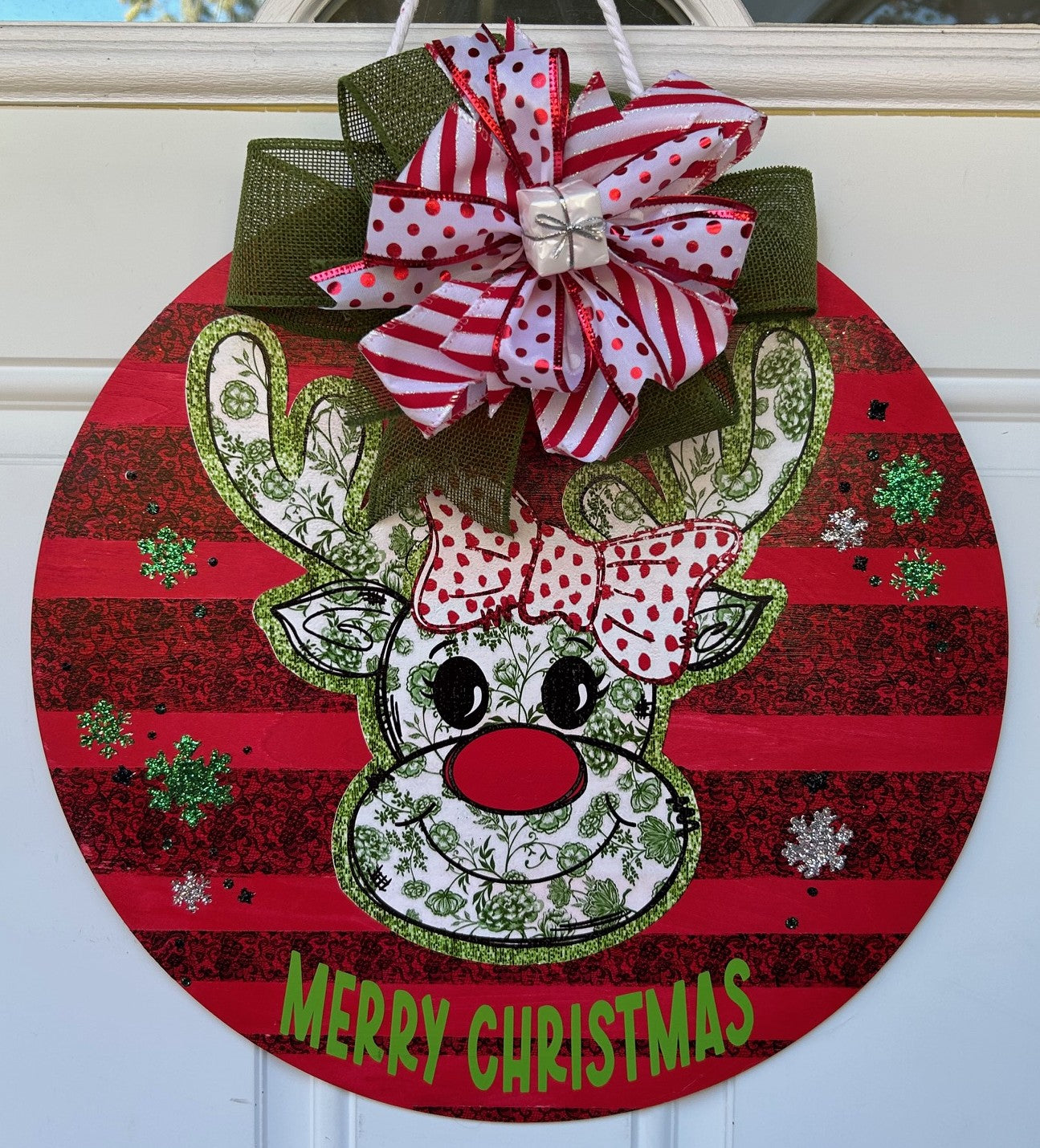 16" Round Wood Door Hanger red, black lace pin stripe, green laced reindeer and glittered snow flakes. With green, red, white pin striped and red white polka dot bow & "Merry Christmas" Text for Christmas Decor.